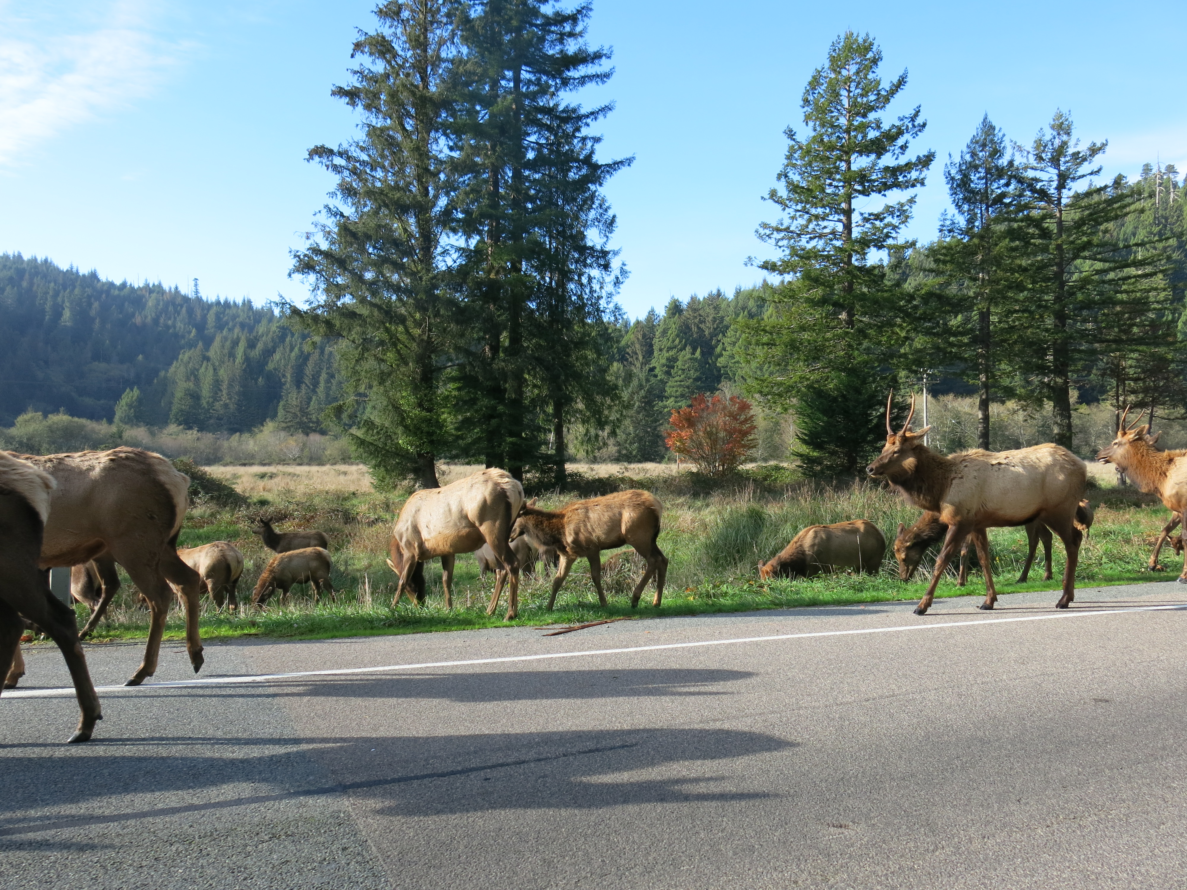 Elks (Wapitihirsche) schlendern gemächlich über die Straße